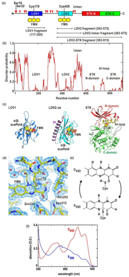 Phot2 from Arabidopsis thaliana comprises 915 amino acid residues and two flavin mononucleotide (FMN) molecules [11] (Figure 1a). The polypeptide chain folds into three functional domains displaying small disorder properties (Figure 1b). Two light-oxygen-voltage domains (designated LOV1 and LOV2 from the N-terminus) [12,13] reside in the N-terminal half. A serine/threonine kinase domain (STK) is in the C-terminal half. LOV is a member of the Per-Arnt-Sim superfamily [14]. In each LOV domain, one FMN molecule is non-covalently bound to a pocket formed in a characteristic arrangement of α-helices and β-strands (α/β-scaffold; Figure 1c,d) [12,15]. The LOV domains of phots from various organisms have similar α/β-scaffold structures and similar binding modes of FMN molecules, as revealed by crystal structure analyses of LOV2 of Adiantum phy3 [15], LOV1 of Chlamydomonas phot [16], LOV2 of Avena phot1 [17], LOV1 of Arabidopsis phot1 and phot2 [18], LOV2 of Arabidopsis phot2 [19], and LOV2 of Arabidopsis phot1 [20].