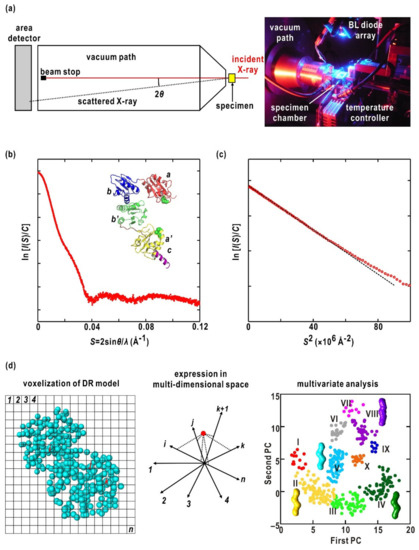 Three-dimensional structures of proteins are very difficult to retrieve from SAXS profiles because these profiles are averaged over both the variation in protein conformations and the orientation of proteins against the direction of the incident X-rays during exposure. To overcome these difficulties, ab initio algorithms have been developed [45,53,54,55], and have also contributed to the vast applications in structural studies of proteins in solution [56]. However, ab initio calculations do not provide a unique structure model, and nonrealistic models can result in calculation trials due to the lack of information in the SAXS profiles. Various attempts to evaluate restored models have been made [57,58]. However, nonrealistic models blurred the details of a model averaged from all restored models. To overcome this problem, we developed a protocol to objectively extract probable models by multivariate analysis and classification for restored models [59] (Figure 2d). This protocol can suggest sets of probable models suitable for discussing structures of proteins together with biochemical and other structural information [43,52].