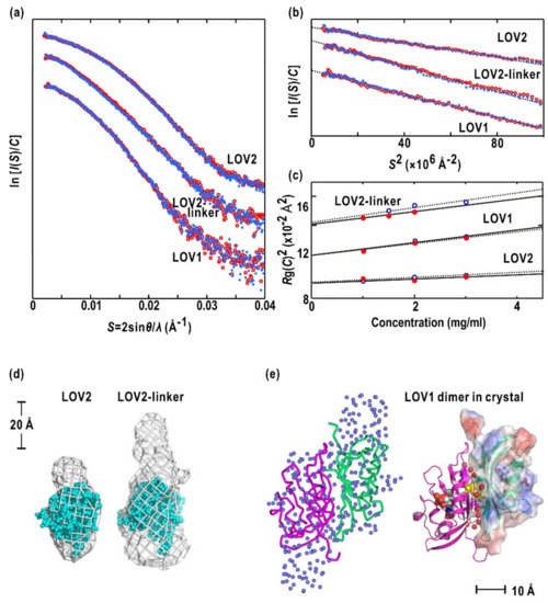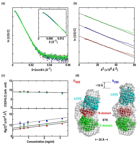 Figure 3a depicts the SAXS profiles of LOV1, LOV2, and LOV2-linker (Figure 1a) in the dark and under BL irradiation. First, the SAXS profiles of each fragment were almost the same between the D450 and S390 states, indicating that conformational changes between the two states were too small to detect in SAXS. The fragments were monodispersive as indicated by the Guinier plots (see the Materials and Methods section), which was approximated by single regression lines (Figure 3b and Table 1) and the linear concentration dependency of both C/I(S,C) [41] and Rg(C)2 (see the Materials and Methods section and Figure 3c).
