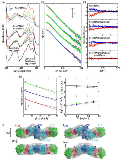 (a) Absorption spectra of Asp720Asn-, Cys170Ala/Asp720Asn-, Cys426Ala/ Asp720Asn-, and Cys170Ala/Cys426Ala/Asp720Asn-mutated phot2. The red and black lines show the D450 and S390 states, respectively. The orange, green, blue, and black (S390) spectra are recorded under BL irradiation (λmax at 450 nm) at a fluence of 10 (orange), 25 (green), 50 (blue), and 200 (black) μmol m−2 s−1. (b) SAXS profiles of (from upper to lower) Asp720Asn-, Cys170Ala/Asp720Asn-, Cys426Ala/Asp720Asn-, and Cys170Ala/Cys426Ala/Asp720Asn-mutated phot2. The SAXS profiles of D450, S390 (blue), and nearly D450 after the dark reversion are indicated by red, blue and green dots, respectively. The concentration of each specimen is 0.8 mg mL−1. (c) Differences in intensities between D450 and S390 (blue dots) and between S390 and nearly D450 after the dark reversion (red) in Asp720Asn-, Cys170Ala/Asp720Asn-, Cys426Ala/Asp720Asn-, and Cys170Ala/Cys426Ala/Asp720Asn-mutated phot2. (d) Guinier plots of D450 (red dots), S390 (blue), and nearly D450 after the dark reversion (green) of Asp720Asn-mutated phot2. Regression lines determined by the Guinier approximation in the region are indicated by arrows. (e) Concentration dependencies of C/I(S,C) (upper panel) and Rg(C)2 (lower) of D450 (red filled-circles), S390 (blue), and nearly D450 after the dark reversion (green) of Asp720Asn-mutated phot2. (f) Averaged molecular shapes of D450 (left panel) and S390 (right) as the most probable sets of molecular models selected using the multivariate protocol [59]. Space-filling models are the crystal structure of LOV1 dimer (PDB accession code: 2Z6D) [18] (blue colored), homology models of LOV2-Jα (cyan), and STK (red for the N-domain and green for the C-domain). The models are viewed from two different directions to demonstrate the bends of the molecular shape in S390. Panels are reused with modification from reference [43] with permission from American Society for Biochemistry and Molecular Biology.