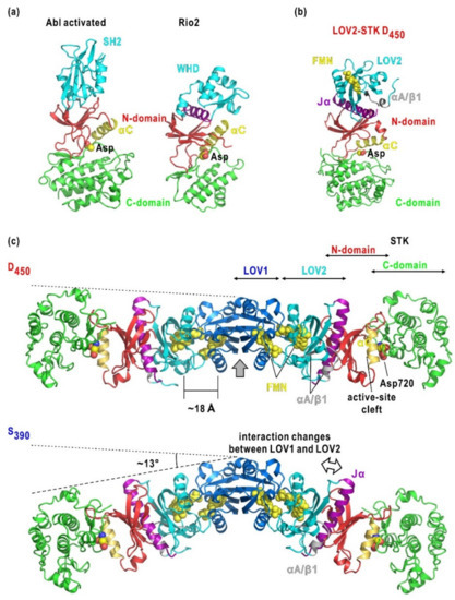 Asp720Asn-mutated LOV2-STK is monomer in solution (Table 1). The data informed the proposed molecular models of D450 and S390. In the D450 model shown in Figure 4d, LOV2 is putatively placed on the small lobe. However, its orientation relative to STK is unclear. To explore the contacts between LOV2 and STK, the interaction modes of regulatory and kinase domains in c-Abl [62] and Rio2 [63] kinases provides a clue (Figure 6a). In each kinase, the regulatory domain (Src homology 2 domain [SH2] in c-Abl or the winged-helix domain [WHD]) touch the curved anti-parallel β-sheet in the N-domain. Particularly, in Rio2 kinase, one helix of WHD associates with the shallow groove of the β-sheet. In the putative model (Figure 6b), LOV2-Jα is placed on the β-sheet of the STK N-domain in the same manner as the helix of Rio2 WHD (Figure 6b). In this association, αA/β1 in the N-terminal region of LOV2, which is crucial for the activation of STK [71], is located near the N-domain of STK.