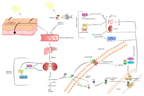 Vitamin D metabolism is regulated by the level of 1,25(OH)2D3 in a negative feedback mechanism [39,40]. Vitamin D inactivating enzyme CYP24A1 is a transcriptional target of 1,25(OH)2D3–VDR–RXR complex. The promoter region of CYP24A1 includes two VDREs that are responsible for the induction of CYP24A1 by 1,25(OH)2D3 [41]. Moreover, 1,25(OH)2D3 stimulates the expression of CYP24A1 by the recruitment of RNA II polymerase and histone H4 acetyltransferases to CYP24A1 gene [42]. Therefore, the level of both calcidiol and calcitriol is regulated by 1,25(OH)2D3-mediated CYP24A1 expression in the kidney. Furthermore, 1,25(OH)2D3 suppresses CYP27B1 transcription in the kidney by complex mechanisms engaging epigenetic modifications of CYP27B1 promoter region [43]. Additionally, studies revealed that vitamin D metabolism is regulated by fibroblast growth factor-23 (FGF-23) and parathyroid hormone (PTH). These biomolecules play a key role in the maintenance of Ca2+ and phosphate homeostasis [44,45,46]. FGF-23 is a hormone secreted by osteocytes and osteoblasts in response to both high serum level of 1,25(OH)2D3 and phosphate [45]. On the one hand, FGF-23 facilitates the secretion of phosphate by suppressing the expression of sodium-phosphate cotransporter 2 (NPT2) placed at the apical membranes of proximal renal tubules. On the other hand, FGF-23 decreases serum levels of 1,25(OH)2D3 by downregulation of CYP27B1 and upregulation of CYP24A1 in the kidney [47,48,49]. In turn, the parathyroid gland secretes PTH in a response to low level of Ca2+ in the serum [44]. PTH induces renal expression of CYP27B1 causing an increase of 1,25(OH)2D3 production [50,51]. It should be recognized that increased 1,25(OH)2D3 stimulates its own degradation via the activation of CYP24A1 expression, whereas PTH sustains the 1,25(OH)2D3 level by the kidney induction of CYP24A1 mRNA degradation [52,53]. Notably, a high Ca2+ level resulting in prolonged induction of 1,25(OH)2D3 negatively regulates PTH secretion by the parathyroid gland in a mechanism of negative feedback mechanism [54]. Figure 1 presents key information about vitamin D as described above.