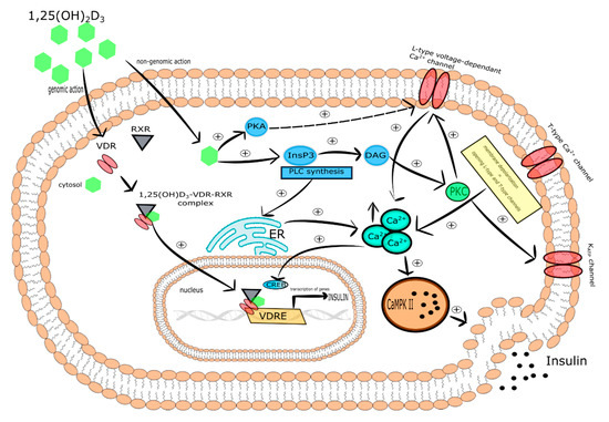 One of the molecular mechanisms by which vitamin D participates in insulin secretion by pancreatic β-cells is the regulation of intracellular Ca2+ concentration. It was reported that 1,25(OH)2D3 reduced the expression of the L-type Ca2+ channels causing a decrease in intracellular Ca2+ concentration and thereby altering calcium signaling. In turn, rapid, non-genomic 1,25(OH)2D3 action was found to be responsible for the increase of cytoplasmic Ca2+ level that activates exocytosis of insulin in the pancreatic β-cells. Two vitamin D-mediated signaling pathways are involved in this process. The first includes PKA activation that phosphorylates various proteins engaged in the function of L-type voltage-dependent Ca2+ channels associated with insulin secretion. The second engages PLC synthesis and the activation of inositol triphosphate (InsP3) triggering the secretion of Ca2+ from ER leading to DAG synthesis. Subsequently, DAG activates PKC that is responsible for the phosphorylation of the KATP channels and L-type voltage-dependent Ca2+ channels. The latter trigger the depolarization of cytoplasmic membrane and opening of T-type Ca2+ and L-type channels that in consequence leads to the elevation of intracellular Ca2+ followed by insulin secretion [116]. PKC is also able to mobilize insulin secretory vesicles that together with increased Ca2+ concentration induce insulin secretion [117]. Furthermore, increased intracellular Ca2+ concentration stimulates insulin secretion via activation of CaMPKII. CaMPKII is a serine-threonine protein kinase occurring in secretory vesicles of insulin. Its primary function is the promotion of phosphorylation of numerous proteins involved in exocytosis, as well as mobilization of insulin vesicles [118]. Another study demonstrated that increased intracellular Ca2+ concentration is associated with the expression of insulin gene via cAMP-responsive element-binding protein (CREB). The activation of CREB occurs in response to numerous stimuli, including glucose growth factors (i.e., the insulin-like growth factor-1 (IGF-1)), incretin hormones (i.e., the glucagon-like peptide-1 (GLP-1), the gastric inhibitory polypeptide (GIP), the pituitary adenylate cyclase-activating polypeptide (PACAP)). All these stimuli lead to the phosphorylation of CREB at serine 133 residue. CREB is a crucial transcriptional element responsible for the efficient transcription of insulin gene, glucose sensing, exocytosis of insulin, and survival of pancreatic β-cells [119].