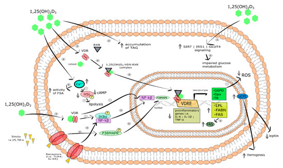 Another anti-inflammatory mechanism of vitamin D action found in murine adipocytes and human preadipocytes involves the inhibition of NF-κB/MAPK pathway [239,240,241,242,243]. NF-κB is known to be an important component of inflammatory pathways in adipose tissue. Its activation and translocation of p65 subunit to the nucleus is a result of IκBα degradation [244]. TNF-α- or LPS- stimulated receptors (i.e., IL-6R, TLR) activate NF-κB or p38MAPK-mediated transcription of pro-inflammatory genes (i.e., IL-6, IL-1β, and TNF-α). Cannel et al. showed that calcitriol inhibited IκBα phosphorylation and then translocation of NF-kB or p38MAPK into the nucleus [245]. Mutt et al. revealed that calcitriol suppressed the release of LPS-stimulated IL-6 in mature human adipocytes and differentiated MSC [240]. Moreover, it was demonstrated that 1,25(OH)2D3 reduced IL-1β-activated expression of pro-inflammatory genes including MCP-1, IL-6, and IL-8. However, the findings from in vitro studies are not in line with in vivo outcomes. On the one hand, Wamberg et al. reported that oral supplementation with vitamin D (700 IU per day) for 26 weeks did not reduce adipose tissue expression or circulating levels of IL-6, IL-8, and MCP-1 in obese patients [246]. On the other hand, in a mice model of obesity induced by a high-fat diet supplementation with calcitriol reduced IL-6 level in adipose tissue was observed [236].