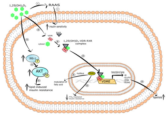Gilsanz et al. demonstrated that increased infiltration of fat in skeletal muscle tissue associated with insulin resistance and related vitamin D deficiency takes place independently of body mass increase [267]. Another study showed that the exposure of L6 and C2C12 myotubes to 1,25(OH)2D3 evoked increased expression of VDR, insulin receptor, and GLUT-4 [268,269]. What is more, it was demonstrated that the incubation of C2C12 myotubes with 1,25(OH)2D3 ameliorated lipid-induced insulin resistance by increased tyrosine phosphorylation of IRS-1 and serine phosphorylation of AKT [270,271]. Calcitriol was also able to increase mRNA of adipose triglyceride lipase (ATGL) and perilipin 2 (PLIN 2) in C2C12 myotubes, thereby revealing its engagement in intramuscular lipid catabolism and lipolysis [272].