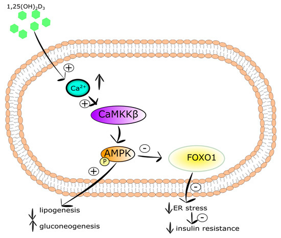 Intracellular Ca2+ concentration in insulin-responsive tissues, including adipose tissue and skeletal muscle, is regulated by several mechanisms. The first mechanism involves the action of PTH that increases intracellular Ca2+ concentration in insulin-responsive tissues, including adipose tissue and skeletal muscle [124,125,126], as well as reducing insulin-induced transport of glucose [127,128]. Therefore, both growing intracellular Ca2+ concentration and the decreasing number of GLUT-1 and GLUT-4 on the cell membranes evoked by PTH promotes insulin resistance observed as reduced glucose uptake [128,129]. There is evidence that vitamin D deficiency is associated with increased PTH levels coexisting with insulin resistance [130,131]. Wright et al. have shown that vitamin D reduced insulin resistance in skeletal muscle as a result of elevation of intracellular Ca2+ concentration and strengthening of GLUT-4 translocation to the membrane of muscle cells and glucose uptake [132].