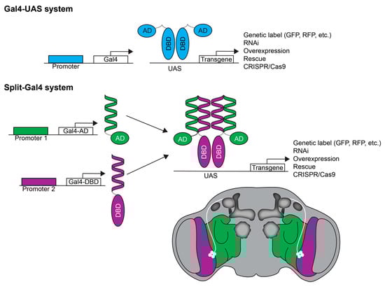The Gal4-UAS system allows precise control of transgene expression. In this binary system, the yeast transcription factor Gal4 is placed under the control of a specific gene promoter, which limits Gal4 expression to select cell types expressing the driver gene. This transgenic construct is combined with a second transgene that places a desired effector gene downstream of the Gal4-binding upstream activation sequence (UAS). Thus, the expression of the effector gene is under spatial and temporal control of a specific gene promoter. The split-Gal4 system uses an intersectional approach to refine Gal4 expression. The Gal4 activation domain (AD) and DNA-binding domain (DBD) are placed downstream of two different promoters. In cells that express both promoters, the AD and DBD combine to form a functional Gal4 protein, which then binds the UAS and drives transgene expression in a more spatially restricted manner. For example, in brain areas where AD (green region) and DBD (purple region) expression overlap (white neurons), the UAS is expressed.