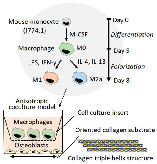 The cooperative relationship between bone tissues and the innate immune system is still not fully understood; hence, a novel approach targeting the molecular mechanisms underlying the bone dysfunction controlled under the immune system is imperative. In this study, an original co-culture model, combining osteoblast cultivation on an anisotropic collagen scaffold with the preferential alignment of collagen fibers and controlled macrophage polarization, was established. The collagen matrix plays an important role as a scaffold for cell adhesion during the tissue regeneration process; cellular responses against collagen alignment mirrors the biological functionality. That is, the evaluation of directional responses against scaffold collagen orientation allows us to understand the cellular ability to construct organized tissues or organs [14]. Further, we showed the unexpected association between osteoblast alignment and the immune system; macrophage activation regulated the ordered arrangement of osteoblast via the IL-6 signaling pathway.