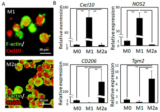 (A) Immunocytochemical analysis of Cxcl10 and CD206 marker expression in M1- and M2-subtype macrophages, respectively, is shown. (B) Gene expression analysis of Cxcl10 and NOS2 as M1 marker genes and CD206 and Tgm2 as M2 marker genes is shown; ** p < 0.01.