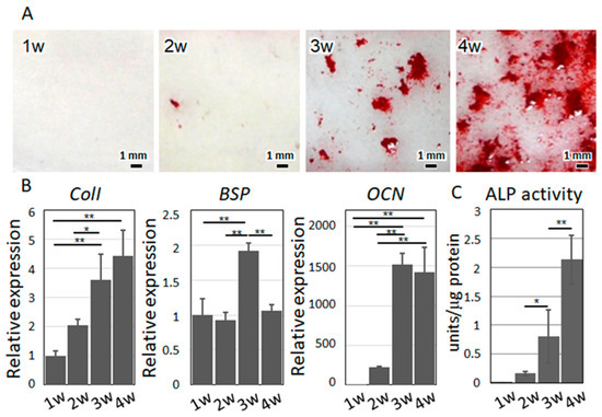 (A) Mineralized nodules were visualized by alizarin red S staining. (B) Gene expression analysis of osteoblast marker molecules. ColI, collagen I; BSP, bone sialoprotein; OCN, osteocalcin. (C) ALP activity depending on the cultivation period is shown. * p < 0.05, ** p < 0.01.