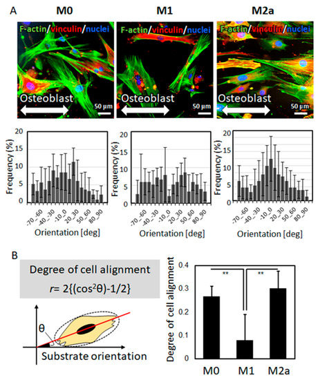Immunological abnormalities or deformities predispose bones to fracture, deteriorating the bone function normally secured by the anisotropic microstructure of the bone matrix [22]. The ordered microarrangement of the bone matrix is constructed by osteoblasts which represent the strictly-controlled unidirectional alignment [14,33]. Osteoblast arrangement is disturbed in pathological conditions, including cancer metastasis [11], resulting in the disordered bone matrix microstructure. Unidirectional osteoblast alignment is strictly controlled by focal adhesion assembly, which determines the directional organization of collagen/apatite [34]. The present study revealed the role of the relationship between macrophage activation and osteoblasts in controlling the anisotropic bone microstructure. Intact osteoblasts exhibited unidirectional alignment, along the orientation of the collagen substrates, via molecular interaction between the amino acid sequence of collagen and integrin receptors [35]. M0 and M2a macrophages exerted no significant effects on the osteoblast arrangement. In contrast, the arrangement of osteoblasts under indirect co-culture with M1 macrophages was significantly disturbed, indicating that pro-inflammatory cytokines altered the cytoskeletal organization and furthered the osteoblast alignment.