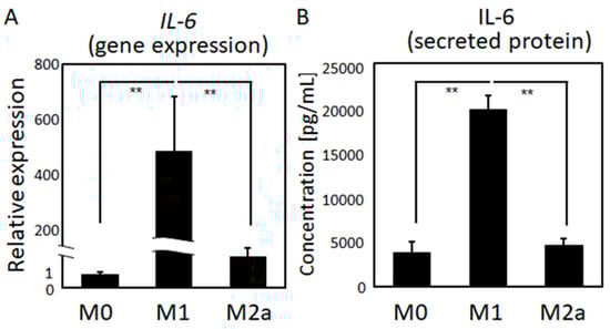 Quantitative comparison of the (A) gene expression and (B) secreted protein levels of IL-6 among the three types of polarized macrophages is shown; ** p < 0.01.