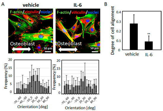(A) Osteoblast alignment, along the orientation of the collagen substrates (indicated by bidirectional arrows), after IL-6 treatment is shown. The angular cell distribution is shown below the corresponding images. (B) The degree of cell alignment is compared between the vehicle and IL-6-treated osteoblasts; ** p < 0.01, vs. vehicle.