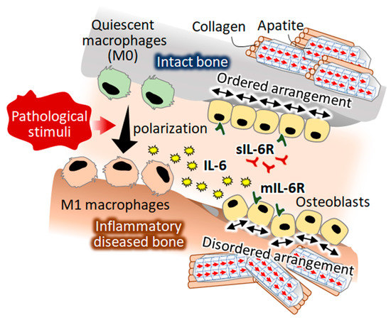 Important bone functions, including providing structural support to the body and inner organs, are dominated by the unique microarrangement of the bone matrix component [1,2,3]. The ordered collagen/apatite microstructure is closely associated with innate and acquired factors that are related to bone metabolism [4,5], the mechanical environment [6,7], or abnormal cancerous cell functions [8,9]. These factors are controlled by mutual activities of bone cells, which include osteoblast–osteoclast coupling [10], cell motility [11,12], and osteocyte-mediated mechanosensing [13]. In particular, osteoblast arrangement is a direct contributor to the oriented construction of the bone matrix [14,15]. Impaired bone cell activities are linked to various bone diseases [16,17]. For example, inflammatory conditions are associated with osteoporosis and increased risk of fractures [18,19]. These inflammatory conditions elicit bone dysfunction by dysregulated cellular activities. The cytokines activated during the inflammatory process exert effects on bone cell activities and further induce bone loss. This is because the inflammatory related cytokines are operative in not only targeting the inflammatory healing process, but also stimulating osteoblast and osteoclast activation [20,21]. Importantly, inflammatory conditions related to the bone healing process or pathogenic stimuli result in the disorganized microstructure of the bone matrix [22], allowing us to hypothesize that the formation of the skeletal microstructure is under the control of the immune system. Moreover, the tumor microenvironment, which is closely related to inflammation, disrupted the osteoblast arrangement and further induced disorganization of the bone matrix microstructure [8].