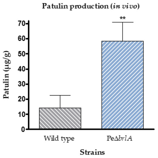 Patulin concentrations measured in Golden Delicious apples after 14 days of incubation showed that the null mutant PeΔbrlA strain not only retained the ability to produce patulin, but produced four times the concentration produced by the WT strain, with 14.11 ± 8.3 µg/g and 58.5 ± 12.5 µg/g (p-value 9.3 × 10−3) fresh weight of apples, respectively (Figure 3).