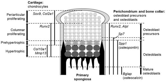 The fibrous layer that surrounds the developing cartilage is called the perichondrium, and it is known as a source of osteo-chondroprogenitors. Some cells in the perichondrium are specified into the osteoblast lineage. The perichondrial cell-derived osteoblasts form the bone collar, a predecessor of cortical bones. The specified population becomes bone-forming osteoblasts through several precursors. Upon their specification, perichondrial cells initially give rise to osteoblast precursors expressing runt-related transcription factor 2 (Runx2). The Runx2-positive precursors then express Sp7 to become Runx2-Sp7 double-positive precursors. Runx2 and Sp7 are master regulators of osteoblast development, as osteoblasts are absent in mutant mice lacking either of them [,]. The double positive precursors eventually differentiate into osteoblasts and mature, secreting bone matrices. Alkaline phosphatase (Alpl), secreted phosphoprotein 1 (Spp1, also known as osteopontin), and bone gla protein (Bglap, also known as osteocalcin) characterize osteoblast precursors, osteoblasts, and mature osteoblasts, respectively.