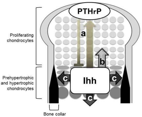 The role of Ihh in association with the action of PTHrP was initially proposed by Lanske et al. and Vortkamp et al. in 1996 [,]. Vortkamp et al. demonstrated that Ihh overexpression in chick limbs suppressed chondrocyte hypertrophy with increased Pthrp expression in the periarticular perichondrium []. The addition of PTHrP rescued premature hypertrophy of Pthrp−/− mouse limbs, whereas Shh had no effect on Pthrp−/− mouse limbs. This result suggests that Hh acts upstream of PTHrP in the growth plate. In the work by Lanske et al., PTHrP and Shh treatment both induced elongation of the growth plate with the suppression of chondrocyte hypertrophy in wild-type limbs, although neither of them had effects on Ppr−/− limbs []. These two studies indicated that the transition from proliferating chondrocytes to hypertrophic ones was regulated by both PTHrP-PPR signaling and Ihh; they constitute a common feedback loop, where the PTHrP-PPR signaling mediated the effect of Ihh on the transition.