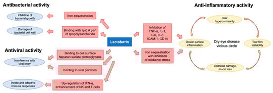 Flowchart showing the mechanisms of action of lactoferrin in ocular diseases. Iron sequestration is the basis of the bacteriostatic effect of lactoferrin. The molecule also has a direct bactericidal activity thanks to its binding with lipid A domains of the bacterial lipopolysaccharide. The binding to viral surface components as well as to heparansulfate proteoglycans inhibits the virus–host cell interaction and is responsible for the antiviral activity. Moreover, lactoferrin regulates innate and adaptive immune responses against infections. The effects of lactoferrin on the vicious circle of dry eye disease are related to the downregulation of numerous pro-inflammatory cytokines as well as to the anti-oxidative activity.