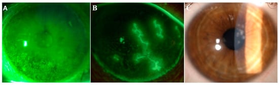 To date, poor evidence is available about the application of lactoferrin in the setting of viral infections of the ocular surface. Special attention has been paid to HSV keratitis, which can lead to corneal blindness in the most severe cases (Figure 2B). HSV has been reported to be present in the trigeminal ganglion of nearly 100% of patients over the age of 60 at autopsy. It might affect every layer of the cornea, and characteristically presents with dendritic lesions at the fluorescein staining test. Once the virus is reactivated from latency within the sensory ganglion, it potentially results in corneal scarring, necrosis and decreased sensation with the onset of neurotrophic keratopathy. This condition is a degenerative disease affecting corneal nerves that amplifies the detrimental effect of HSV infection on the ocular surface by reducing both protective reflexes and the release of trophic neuromodulators that are essential for the vitality, metabolism and wound healing of surface tissues. As a result, impaired corneal innervation leads to spontaneous epithelial breakdown, persistent epithelial defects and ulceration with subsequent onset of vision issues []. Both in vivo and ex vivo anti-herpetic activities of lactoferrin have been investigated. The binding of lactoferrin to virus receptors on target cells prevented virus attachment and entry, whereas orally administered lactoferrin increased the production of Th1 cytokines, including IFN-gamma, IL-12 and IL-18, which may adjuvate host protection against HSV infection [,,,,,].