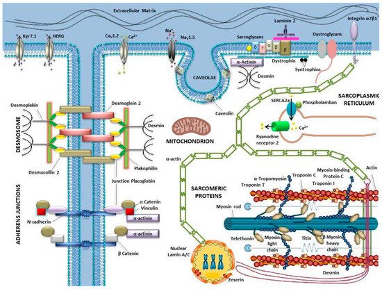 Cartoon of the cardiomyocyte components involved in the molecular mechanisms associated with sudden cardiac death (SCD). The figure illustrates the main ion channels (Kyr7.1, HERG, Cav1.2, Nav1.5, Ryr2) linked to channelopathies (long QT syndrome (LQTS), Brugada syndrome (BrS), catecholaminergic polymorphic ventricular tachycardia (CPVT)); sarcomere proteins associated to hypertrophic cardiomyopathy (HCM); proteins participating in the organization of desmosomes and adherents junctions, linked to arrhythmogenic cardiomyopathy (ACM); the cytoplasmic, mitochondrial, sarcoplasmic reticulum proteins and the proteins of the dystroglycan complex that are associated with the development of dilated cardiomyopathy (DCM).