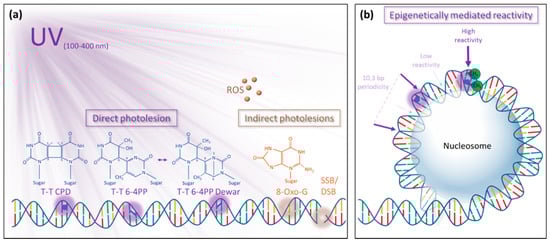 This review will describe the different types of UV-induced DNA lesions and will present the current knowledge in the putative interconnections existing between epigenetic marks and photodamage formation. In addition, the mode of action and the structural features of photolesions recognition factors, acting in the different DNA repair pathways, will be highlighted.
