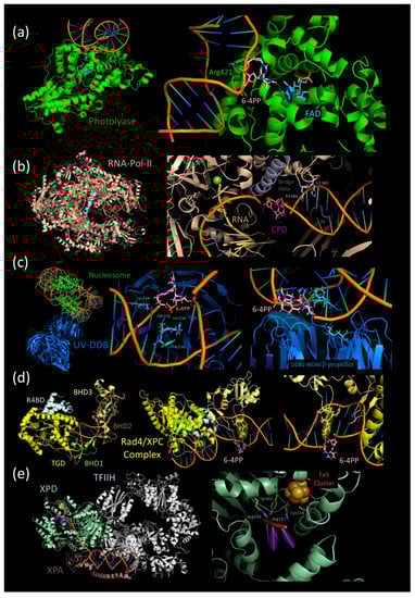 Structural views of the main photolesions recognition factors. (a) Left panel: in silico modeling of the Drosophila melanogaster (6-4) photolyase bound to double-stranded (ds) DNA with a “out-flipped” T-T 6-4PP. Figure is based on the PDB structure 3CVU []. The photolyase and these residue Arg421 are colored in green, the catalytic FAD ligand is colored in cyan blue, and the 6-4PP is in light pink. Right panel: Zoomed-in detailed view of the photolyase–lesion interaction. (b) Left panel: in silico modeling of a Saccharomyces cerevisiae RNA polymerase II elongation complex arrested at a CPD lesion. Figure based on the PDB structure 6O6C []. The RNA Pol II is colored in salmon, the Pol II bridge helix and the residues R1386 and H1387 are colored in gray-blue, the nascent RNA is in gold, and the CPD is in violet. Right panel: Zoomed-in detailed view of the RNA Pol II–lesion interaction. (c) Left panel: In silico modeling of the Homo sapiens UV–DDB complex bound to a “out-flipped” 6-4PP in double-stranded DNA (dsDNA) wrapped around a nucleosome. Figure is based on the PDB structure 6R8Y []. The UV–DDB complex is colored in blue, the DDB2 residues Lys244, Phe34, Gln335, and His336 are in cyan, the nucleosome is in green, and the 6-4PP is in light pink. The photolesion binding pocket is highlighted with a blue hallow. Right panel: Zoomed-in detailed view of the DDB2–lesion interaction. (d) Left panel: In silico modeling of a Saccharomyces cerevisiae Rad4–Rad23 complex (XPC complex homologue) bound to a 6-4PP photoproduct. The figure is based on the PDB structure 6CFI []. The Rad4 TGD (Transglutaminase homology domain) is colored in yellow, the BHD1 (ß-hairpin domain 1) is in lime-yellow, the BHD2 domain is in gold, the BHD3 domain is in pale-yellow, the Rad23 R4BD domain is in white, and the 6-4PP is in light pink. Right panel: Zoomed-in detailed view of the Xeroderma Pigmentosum complementation group C (XPC)–lesion interaction. The helix insertion hairpin from the BHD3 domain is highlighted with a yellow hallow. (e) Left panel: In silico modeling of the Homo sapiens core TFIIH–XPA–DNA complex without photolesion. Figure is based on the PDB structure 6RO4 []. The TFIIH is colored in white, the XPA (Xeroderma Pigmentosum complementation group A) protein is in salmon, the FeS cluster is in yellow and orange, and the XPD protein and its Arg112, Cys134, Tyr192, and Arg196 residues are in pale green. Right panel: Zoomed-in detailed view of the XPD–lesion interaction. The theoretical localization of the photolesion during the recognition step is highlighted with a violet hallow. All figures were created using PyMOL (The PyMOL Molecular Graphics System, Version 2.0 Schrödinger, LLC.).
