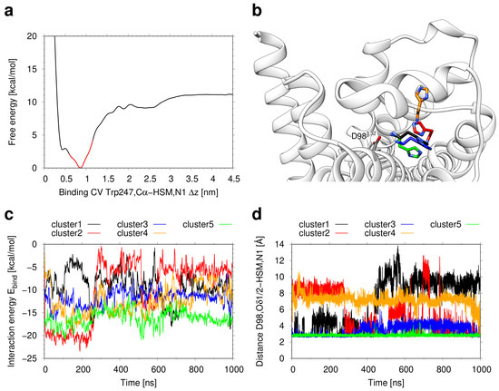 The simulation of histamine binding to the H2R was done using the previously established protocol from Söldner et al. [41] that combines multiple walker metadynamics simulations with a ligand clustering protocol and refinement by cMD. The free energy landscape derived from the respective metadynamics simulation is shown in Figure 2a. The shape of this curve is similar to those observed in previous ligand binding simulations [41,44] and indicates an energy minimum within the orthosteric pocket of the receptor. According to the strategy from Söldner [41] structures within 3 Å of the global minimum (red segment in Figure 2a) were grouped into five clusters. The representative structures from these clusters were all located in the orthosteric pocket but exhibited certain differences in their orientation and interactions in the pocket (Figure 2b).