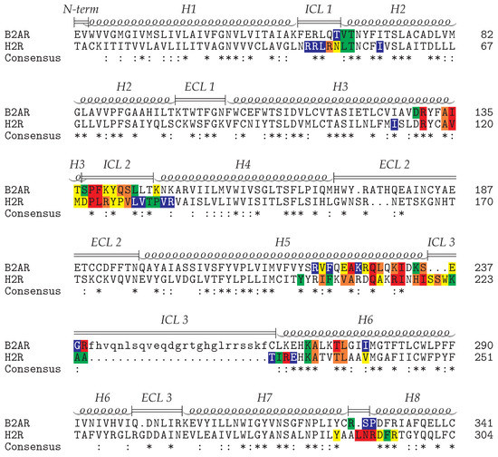 Sequence alignment of the histamine H2 receptor (H2R) and the adrenoceptor (B2AR). The sequences are shaded according to the number of contacts (red > orange > yellow > green > blue) that the respective residues formed with the Gs protein during the simulations (H2 receptor: H-Gs-cMD1, H-Gs-cMD2) or in the crystal structure ( adrenoceptor: PDB code 3SN6). The approximate length of the structural elements is indicated above the alignment. The ICL3 residues in lower case letters are not resolved in the -AR crystal structure.