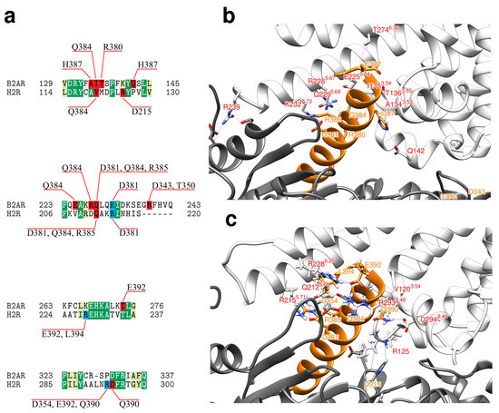 Specific interactions of the Gs protein in complex with H2R and 2AR. (a) Alignment of the sequence stretches from H2R and 2AR that form the main contacts with Gs. Identical and similar residues are colored in dark and light green, respectively. Residues that form hydrogen bonds or salt-bridges to Gs are highlighted in red and blue, respectively. Interacting residues of Gs are given above and below the alignment. (b) Crystal structure of 2AR-Gs complex (white and gray ribbon) in complex with C-terminal helix Gs-5 highlighted in orange. Interface residues are shown in stick presentation and polar interactions are marked by dotted lines. Residues belonging 2AR and Gs are labeled in red and orange, respectively (c) Representative structure of H2R-Gs complex (white and gray ribbon) in complex with C-terminal helix Gs-5 highlighted in orange. Interface residues are shown in stick presentation and polar interactions are marked by dotted lines. Residues belonging to H2R and Gs are labeled in red and orange, respectively.