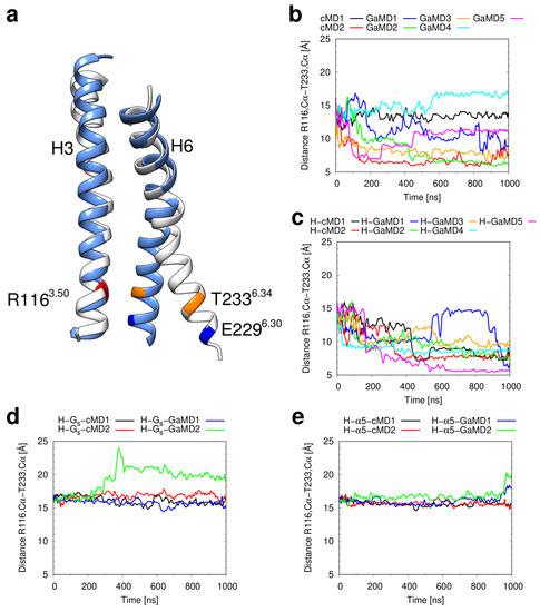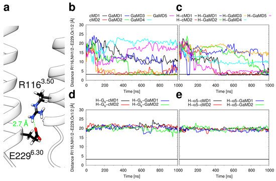 The inward motion of the intracellular end of H6 is generally described as a hallmark of GPCR inactivation [13,54]. We investigated whether additional structural features of inactive H2R emerge during our simulations. One such feature is the formation of the “ionic lock” between the oppositely charged sidechains of E2296.30 and R1163.50 (Figure 7). Ionic lock formation is observed in simulations of apo H2R and histamine-bound H2R (Figure 7b,c), but not in complexes containing the Gs or Gs-5 (Figure 7d,e). Comparison of the distances obtained from the individual simulations between Figure 6 and Figure 7 reveals that the inward motion of H6 generally correlates with ionic lock formation, i.e., the ionic lock appears to be the energetically most favorable sidechain arrangement when H3 and H6 are in close distance. This is remarkable, because the 2AR, which was used as a template for H2R modelling, does not display an ionic lock in the crystal structures of the inactive state (PDB code 5JQH [55]). However, in contrast to the crystal structure, long-timescale MD simulations of the 2AR show the ionic lock formation, which indicates the presence of a conformational equilibrium between conformations with the lock formed and the lock broken [56,57].