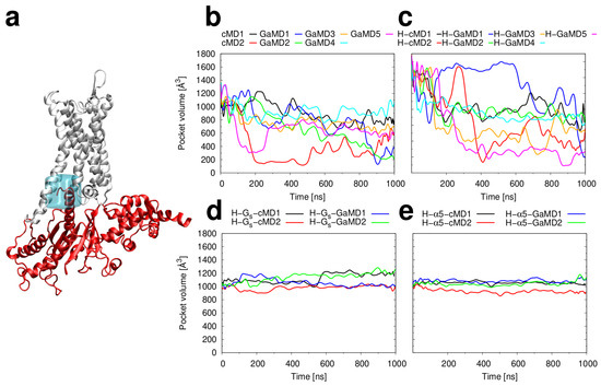 Volume of the G protein binding pocket. (a) Backbone representation of the H2R (white) and the Gs subunit (red). The location of the G protein binding pocket is shown as a blue box. (b–e) Plots of the volume as a function of simulation time for the simulations of (b) the apo H2R, (c) the H2R in complex with histamine, (d) the ternary complex of the H2R, histamine, and the Gs protein and (e) the complex of H2R, histamine, and the Gs-5 helix.