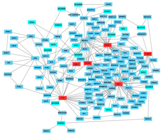 Network of the selenoproteins mapped on the human interactome. In detail, the selenoproteins are shown in cyan, HUB nodes are shown in red, whereas the other nodes are shown in blue.