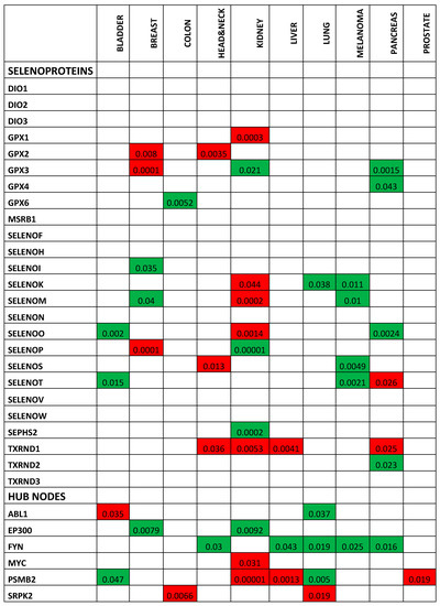 The selenoprotein family has a well-established function in regulating oxidative cell balance [48], and is involved in tumorigenesis and cancer progression [6]. Still, identifying tumor type-specific selenoprotein profiles, and determining whether these proteins can predict prognosis or could serve as therapeutic anticancer targets in cancer patients, represent critical challenges. In this study, we created an interaction network of the twenty-five known selenoproteins and highlighted the presence of six HUB nodes (ABL1, EP300, FYN, MYC, PSMB2, and SRPK2) that play the strongest role in coordinating the obtained network. Then, we evaluated the correlation between the gene expression of the twenty-five selenoproteins and HUB nodes, and the OS of patients with the ten most common solid tumor types, with the results demonstrating that (i) ten selenoproteins were not correlated with poor OS of cancer patients; (ii) more correlations between selenoprotein gene expression and patient OS were only observed for kidney, pancreas, and breast cancers; (iii) single selenoprotein expression and OS of prostate cancer patients was not observed; and (iv) all HUB nodes were correlated with poor OS for at least one cancer type.