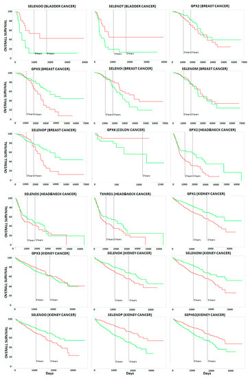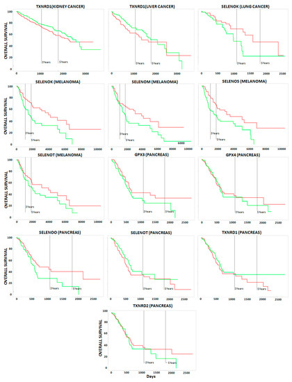 This analysis demonstrated that (i) no correlation occurred between single selenoprotein expression and poor OS in the case of prostate cancer patients; (ii) no correlation occurred between ten selenoproteins (DIO1, DIO2, DIO3, MSRB1, SELENOF, SELENOH, SELENON, SELENOV, SELENOW, and TXNRD3) and poor OS in any of the ten analyzed cancer types; and iii) a statistically significant correlation occurred between the expression levels of the fifteen selenoproteins with poor OS in at least one cancer type (Figure 2 and Figure 3).The largest number of selenoproteins with altered gene expression, either upregulation or downregulation, in tumor tissues compared with normal tissues, and correlations with poor OS, were found in kidney (eight), pancreas (six), and breast (five), cancers. The expression of some selenoproteins was altered in more than one cancer type; however, in the majority of cases, different patterns of selenoprotein gene expression were observed among the cancers examined. The only exceptions were (i) GPX2, whose high expression levels correlated with OS in breast and head and neck cancers; and (ii) TXNRD1, whose high expression levels correlated with poor OS in head and neck, kidney, liver, and pancreas cancers.