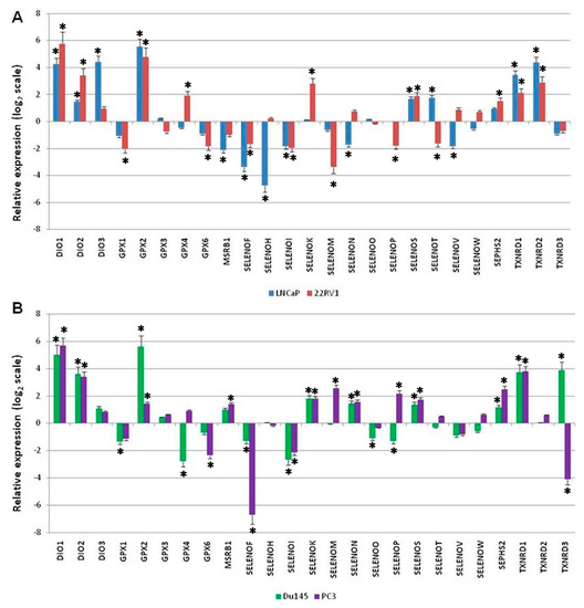 Fold change of gene expression level for each selenoprotein (indicated as the relative expression) in (A) two androgen receptor-positive (LNCaP and 22RV1) and (B) two androgen receptor-negative (DU145 and PC3) prostate cancer line cells, compared to the non-cancerous epithelial cells (EPN) cells, as evaluated by the 2−ΔΔCq method, and reported on the log2 scale. We considered values higher and lower than +1 and −1 to be statistically significant, respectively. The statistically significant p-values at <0.05 are indicated by *.