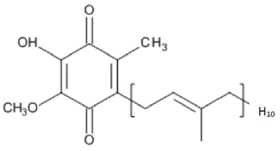 Coenzyme Q10 (CoQ10) is a lipid-soluble molecule comprising a central benzoquinone moiety, to which is attached a 10-unit polyisoprenoid lipid tail [1] (Figure 1). The benzoquinone ring contains redox active sites, whereas the polyisoprenoid chain is responsible for positioning the CoQ10 molecule within the mid-plane of the lipid bilayer of various cell membrane types. CoQ10 is usually described as a vitamin-like substance, although by definition, CoQ10 is not a vitamin, since it is produced by various tissues within the human body. The synthesis of the CoQ10 molecule comprises three major steps, namely, synthesis of the benzoquinone structure from 4-hydroxybenzoate (derived from either tyrosine or phenylalanine), synthesis of the polyisoprenoid side chain from acetyl-coenzyme A (CoA) via the mevalonate pathway, and condensation of these two structures to form coenzyme Q10; the benzoquinone ring structure is then subject to further modification via hydroxylation, methylation and decarboxylation to form CoQ10 [2]. There are several potential rate-limiting steps in the overall CoQ10 biosynthetic pathway, including synthesis of the polyisoprenoid chain (via HMG-CoA reductase) and condensation of the polyisoprenoid chain and benzoquinone ring (via prenyltransferase) [3].