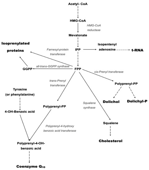 Schematic of the mevalonate pathway responsible for the biosynthesis of CoQ10. Solid arrows represent single biosynthetic reactions; Dashed arrows represent multiple biosynthetic reactions.