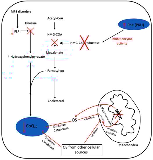 OS-induced degradation of CoQ10 has been suggested as a possible contributory factor to the deficit in the level of this isoprenoid reported in certain diseases, although this has yet to be confirmed or refuted [49]. In addition, the possibility arises that OS may also inhibit the enzymes of the CoQ10 biosynthetic pathway, which may also cause a diminution in cellular CoQ10 status, although this putative mechanism has yet to be investigated. Figure 4 outlines the possible causes of secondary CoQ10 deficiency in PKU, MPS and METC disorders.