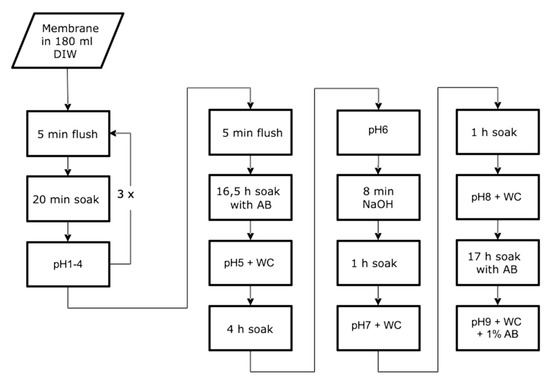 Flow chart depicting the washing and pH neutralization process for post-treatment during membrane production. DIW = Deionized water. AB = 1% Antibiotic (Pen Strep (Gibco Life Technologies, Carlsbad, CA, USA) with 10.00 units/mL Penicillin and 10.00 μg/mL Streptomycin). WC = Water change. Flush = Flush under running distilled water. Soak = Leave in 180 mL deionized water. pH = Measure pH value while stirring for 5 min. NaOH = Leave in 0.01 M NaOH solution.