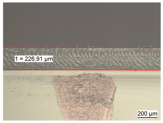 Thickness measurement procedure on a SF12 membrane. Thickness is determined by measuring the vertical distance between the two red parallel lines placed on the outer edges of the membrane cross-section. Top layer: blank space, middle: membrane, bottom layer: glass support.