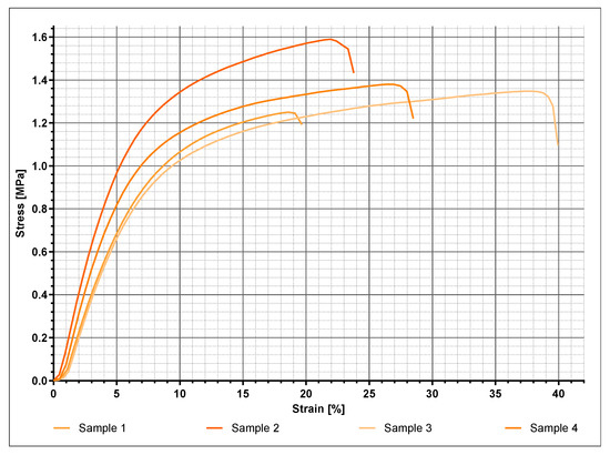 The Membranes initially experienced a constant thinning out from both sides under increasing load, with them finally rupturing in exactly these areas. Figure 5 exemplarily indicates the stress–strain relationship of four SF10 membranes. The membranes displayed comparable elastic behavior, with noticeable differences in maximum tensile strength and associated strain, respectively. Within the first half towards maximum tensile strength, the linear relationship suggests elastic deformation. The further course of the mechanical response indicates a subsequent increasing proportion of plastic deformation. For the purpose of comparative evaluation concerning the various fibroin concentrations, the mean values of maximum stress and corresponding strain were statistically analyzed (Figure 6 and Figure 7).