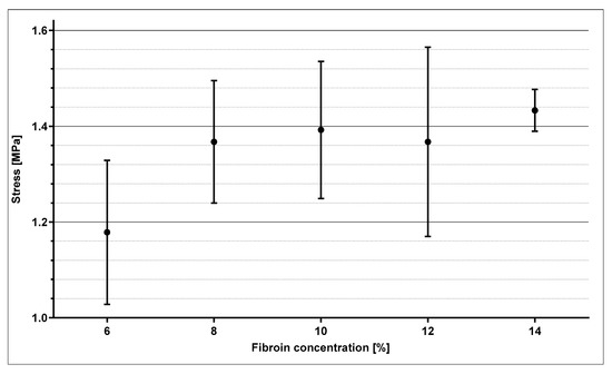 Mean value and standard deviation of maximum stress of the different membranes in relation to fibroin concentration.