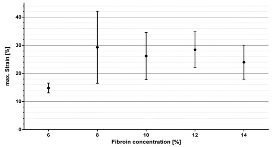Mean value and standard deviation of maximum strain of the different membranes in relation to fibroin concentration.