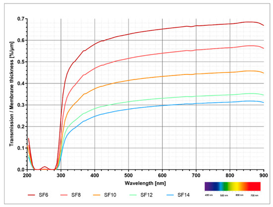 In addition to mechanical properties, optical properties are also of crucial importance for the function of fibroin membranes in biomedical engineering, especially when applied in corneal replacement. Depending on the intended use, here, transparency is either of primary or at least secondary importance. If envisioned as a type of cornea replacement, it is undoubtedly crucial that a non-functionalized membrane is permeable to visible light [41]. However, if used in other applications, as for example in wound dressings or as a separating measure in order to distinguish different tissue layers in surgery, transparency is of secondary importance. If used as a substitute for corneal tissue, a transmittance of 85% in the visible spectrum ranging from 400 nm to 780 m is required, whereas UV radiation, which is known to be harmful to the eye (approximately 100 nm to 400 nm), is highly undesirable [42]. The membranes produced in this study exhibited highly favorable optical properties, without undergoing further functionalization. Nevertheless, an increased concentration of fibroin led to a decrease in transmittance per thickness. Starting at wavelengths of approximately 520 nm, membranes of all fibroin concentrations expressed a transparency larger than 85%. SF6 membranes even illustrated transparency at 410 nm. Compared to other fibroin membranes described in the literature, the membranes manufactured in this study endorsed either comparable or improved optical properties in the range of visible light [40,41].