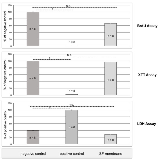 Novel biomaterials must pass certain toxicity tests based on part 5 of the standard ISO 10993 (ISO 10993 Biological Evaluation of Medical Devices. Standard. International Organization for Standardization (ISO), Geneva, Switzerland) in order to ensure biocompatibility and safety. Thus, corresponding indirect in vitro assays were performed to check for compatibility of extractive compounds gained from fibroin membranes tinged with formic acid and CaCl2. Ninety-six-well plates were seeded with 1 × 104 L929 cells per well in 100 µL cell culture medium and then incubated for 24 h under cell culture conditions. The cell culture medium was subsequently discarded and 100 µL of membrane extract was applied to each well. The cells were incubated for another 24 h and consecutively exposed to the BrdU and XTT tests, whereas the respective supernatants were subjected to lactate dehydrogenase (LDH) testing. Similar assays were performed for all extracts, except for the control prepared in order to detect any possible assay interferences, which was formulated without cells. Blank controls (medium alone without cells) were subtracted from the absorbance values in order to adjust the readout at all times.