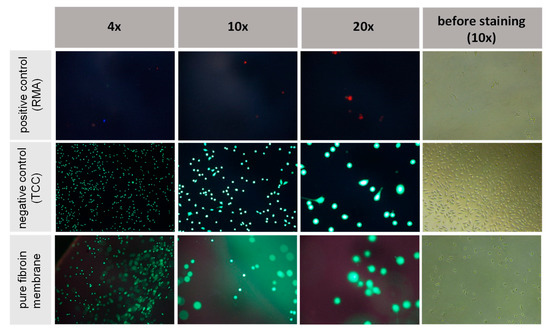 To confirm the results of the indirect tests, the viability and adhesion of fibroblast cells was examined via direct cultivation on the silk membranes along with their respective controls and subsequent staining of the cultivated cells. Three samples (n = 3) of fibroin membranes fabricated via the formic acid and calcium chloride method and both reference materials were examined by fluorescent reflective light microscopy. Representative images were then selected for presentation, as seen in Figure 10. Following live–dead staining, all fibroblasts cultivated on both the fibroin membranes and the negative control (TCC) remained thoroughly vital, as clearly represented by green fluorescent and well-spread, spindle-shaped cells. Beside some single dead (red stained) cells, the toxic positive control (RMA) demonstrated almost no cells adhering to the surfaces at all, while the absence of red stained cells on the manufactured membranes also confirmed the supposed absence of toxicity. In summary, both the indirect and direct cytotoxicity tests indicated a good bio-response of the fibroin membranes tinted with formic acid and CaCl2, without occurrence of any cytotoxic effects.