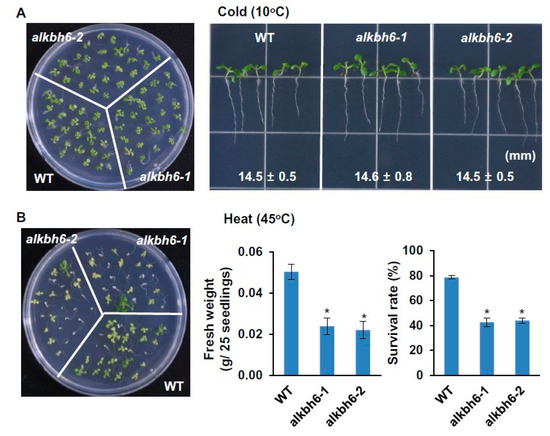 Seedling and root growth of the alkbh6 mutants under cold or heat stress. (A) The wild-type (WT) and alkbh6 mutants were grown at 10 °C, and root lengths were measured four weeks after germination. (B) Three-day-old seedlings were treated at 37 °C for 1 h and then subjected to heat stress at 45 °C for 4 h. Survival rate and fresh weight of the plants were measured seven days after heat treatment. Values are the mean ± SE obtained from three independent experiments, and the asterisks above columns indicate significant differences (* p ≤ 0.05).
