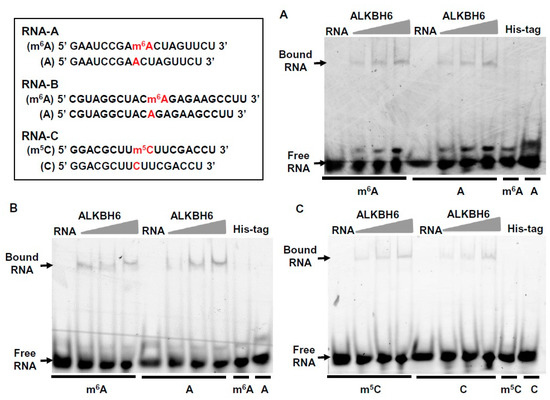 Although the knockdown of the expression level of ALKBH6 did not alter the m6A- and m5C-level, we next evaluated whether ALKBH6 can bind to an m6A- or m5C-modified RNA. The recombinant ALKBH6 protein was purified, which contained ALKBH6 and a small amount of His-tag-Trigger factor present in the pCold trigger factor (TF) DNA vector (Figure S8). The 5′-fluorescein-labeled RNA substrates were synthesized and used in an electrophoretic mobility shift assay (EMSA). Two m6A-labeled RNA substrates were used in this assay; one RNA substrate containing a conserved RRACH motif (R = G/A, H = U/A/C), which was derived from the Arabidopsis Salt Overly Sensitive 3 (SOS3) RNA (5′-GAAUCCGAm6ACUAGUUCU-3′ and 5′-GAAUCCGAACUAGUUCU-3′) [40], and another RNA substrate containing a conserved UACAGAGA motif, which was derived from the human S-adenosylmethionine synthase (MAT2A) RNA (5′-CGUAGGCUACm6AGAGAAGCCUU-3′ and 5′-CGUAGGCUACAGAGAAGCCUU-3′) [41]. The m5C-labeled RNA substrate was derived from the conserved m5C motif found in Arabidopsis (5′-GGACGCUUm5CUUCGACCU-3′ and 5′-GGACGCUUCUUCGACCU-3′) [42]. The results of the EMSA showed that the addition of ALKBH6 retarded the migration of both m6A-labeled- and unlabeled-RNAs, as well as both m5C-labeled- and unlabeled-RNAs (Figure 6). By contrast, the addition of His-tag-Trigger factor alone did not retard the migration of the RNAs. Collectively, these results indicate that ALKBH6 has an ability to bind to m6A- or m5C-labeled RNAs, suggesting its possible role as an m6A or m5C eraser.