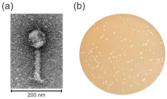 Characteristics of the virion (a) and plaques (b) of the vB_SspM_BZS1. The scale bar in the transmission electron microscopy (TEM) image represents 200 nm.