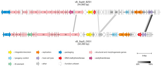 Genome organization and location of homologous proteins of vB_SspM_BZS1 and vB_SspS_OS31 phages. Arrows indicate transcriptional orientation of genes. Selected predicted protein functions are indicated by colored arrowed according to the legend. Numbers on arrows refer to locus tags, i.e., PhiBZS1_pX or PhiOS31_pX, where X refers to gene number in Tables S2 and S3. Additionally, lines connecting BZS1 and OS31 arrows reflect protein sequence similarity according to the scale. For better clarity circular permutation of the vB_SspS_OS31 genome is presented.